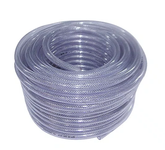 Mangueira produzida em PVC flexivel transparente, reforcada com fios de poliester de alta resistencia, garantindo durabilidade e seguranca.