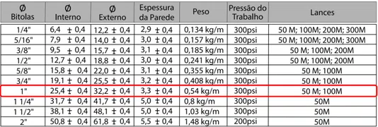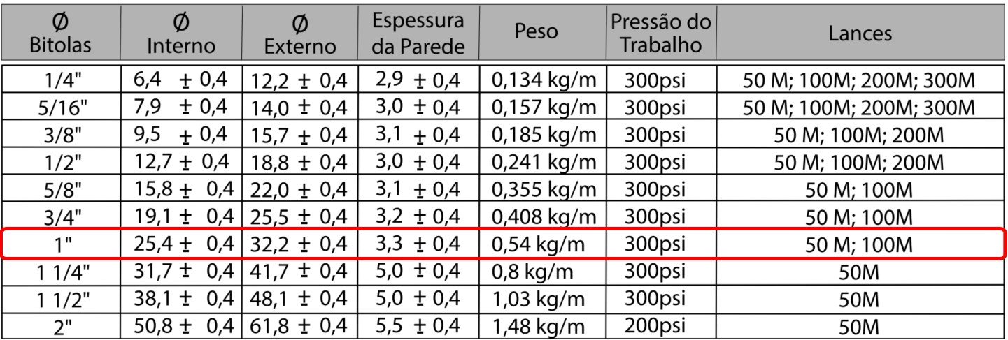 MANGUEIRA MD-300 5/8" PRETA - VENDA POR METRO - LANCE MINIMO 50 METROS Descricao do produto A Mangueira Flexivel AR/AGUA 300 PSI 5/8 DN1 Bariflex e fabricada em PVC preto com trama de poliester de alta tenacidade, proporcionando flexibilidade, durabilidade e resistencia a abrasao. Desenvolvida para aplicacoes industriais e de manutencao, e a solucao ideal para conducao de ar comprimido e agua em sistemas de pressao. Aplicacoes • Compressores de ar • Instalacoes pneumaticas • Servicos de lavagem • Conducao de ar ou agua em sistemas industriais e comerciais Especificacoes Tecnicas • Pressao de trabalho: 300 PSI • Temperatura de trabalho: +5 °C a +50 °C • Material: PVC preto com reforco em trama de poliester de alta tenacidade • Estrutura: Flexivel e resistente a abrasao Dados Complementares • Armazenar em local adequado, protegido da acao solar direta • Temperatura de armazenamento recomendada: +5 °C a +35 °C Observacoes Importantes O procedimento de prensagem da mangueira Bariflex Rubber nao e regulamentado por norma tecnica. Dessa forma, a prensagem pode oferecer riscos e anula a garantia de fabrica.